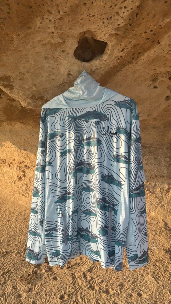 قميص بأكمام طويلة مصنوع من قماش خفيف مناسب للأجواء الحارة. يتميز بلونه الابيض وتصميمه العصري، مع طباعة فنية على الظهر تصور سمكة خيل البحر، مما يعطي القميص طابعًا بحريًا مميزًا. يبدو القماش مريحًا ومناسبًا للأنشطة الخارجية مثل الصيد، التجديف، أو المغامرات البحرية. كما أن الشعار المطبوع عند الرقبة باللغة العربية يعزز من الهوية الثقافية للعلامة التجارية.